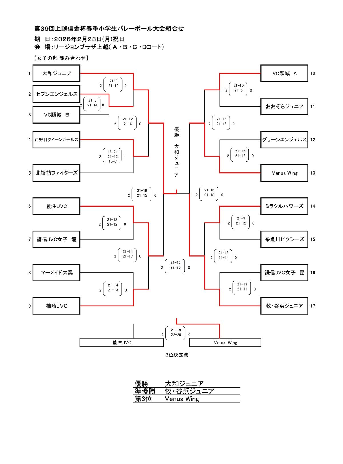 2026.02.23 小学生 第39回上越信金杯春季小学生バレーボール大会の結果をお知らせします。 後援 上越信用金庫柿崎支店 様 裕和会 様 第39回上越信金杯春季小学生バレーボール大会 女子 男子 女子 page top 男子 page top