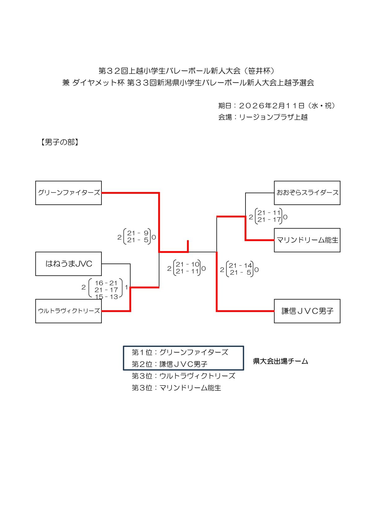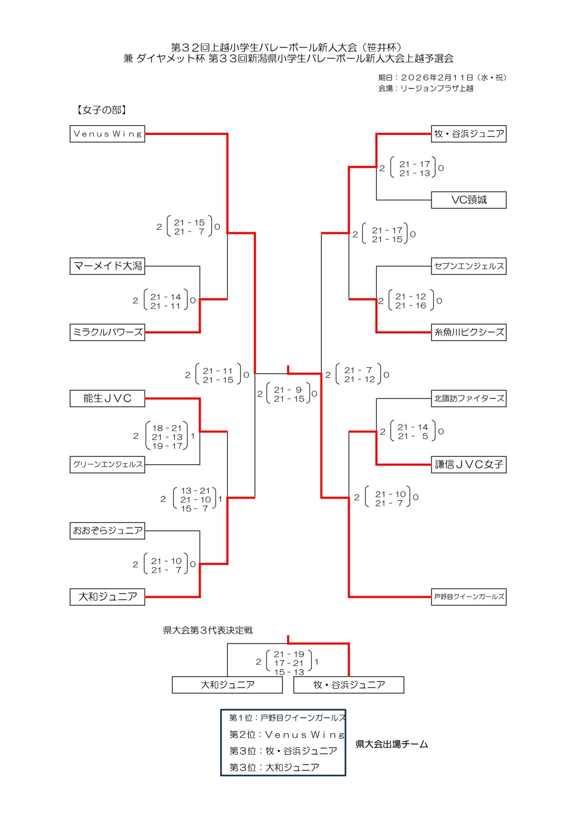 2026.02.11 小学生 第32回上越小学生バレーボール新人大会(笹井杯)兼ダイヤメット杯第33回新潟県小学生バレーボール新人大会上越予選会の結果をお知らせします。 第32回上越小学生バレーボール新人大会(笹井杯)兼ダイヤメット杯第33回新潟県小学生バレーボール新人大会上越予選会 女子 男子 女子 page top 男子 page top